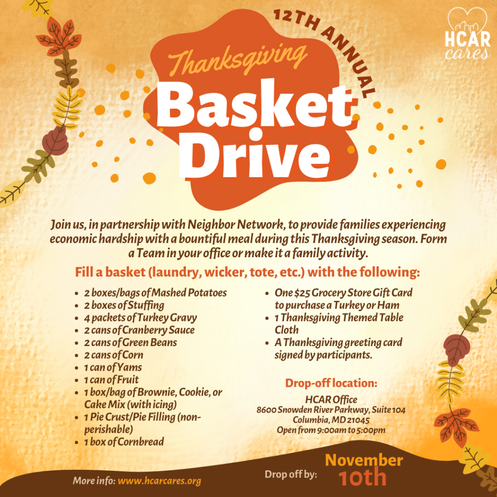 It’s That Time of Year Again! 🍂🦃📆 Join HCAR Cares and the HCAR Cares Community Outreach Committee in our 12th Annual Thanksgiving Basket Drive with Neighbor Network! We’re collecting baskets until November 10th. Help us surpass last year’s 400 baskets and bring joy to more families. Download the flyer here or pick one up at the HCAR Office. Let’s make this year’s drive the best yet! 💛 Prefer to donate instead of shop?We’ve made it easy — give $100 or more and we’ll do the shopping for